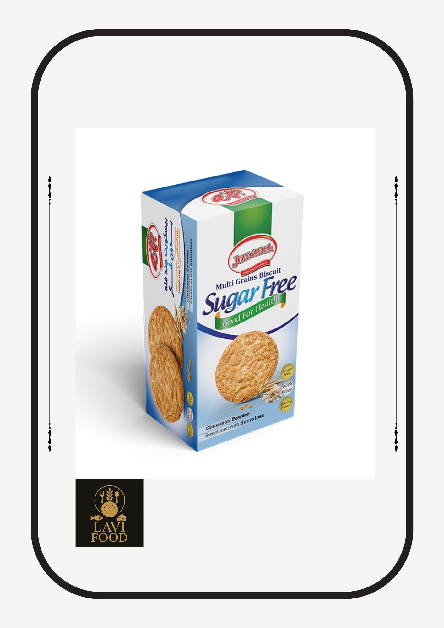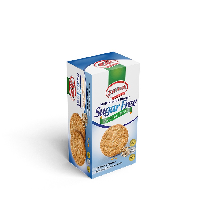 بیسکویت چندغله بدون شکر جمانه شیرین شده با سوکرالوز میان وعده ای کامل رژیمی مناسب برای افراد دیابتی و افرادی که به سلامتی خود اهمیت می دهند این محصول دارای پودر دارچین می باشد ارزش غذایی ذکر شده برای هر 3 عدد بیسکویت یک سهم معادل 42 گرم ذکر شده است.